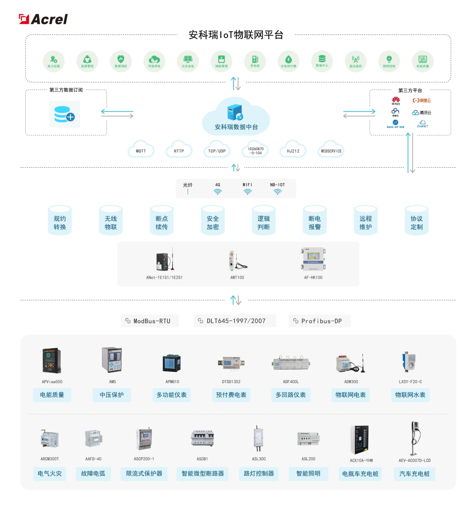 AcrelCloud-5000能耗管理云平臺采用泛在物聯、云計算、大數據、移動通訊、智能傳感等技術手段可為用戶提供能源數據采集、統計分析、能效分析、用能預警、設備管理等服務,平臺可以廣泛應用于多種領域。